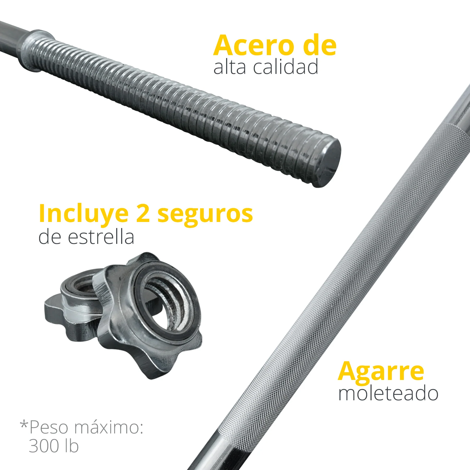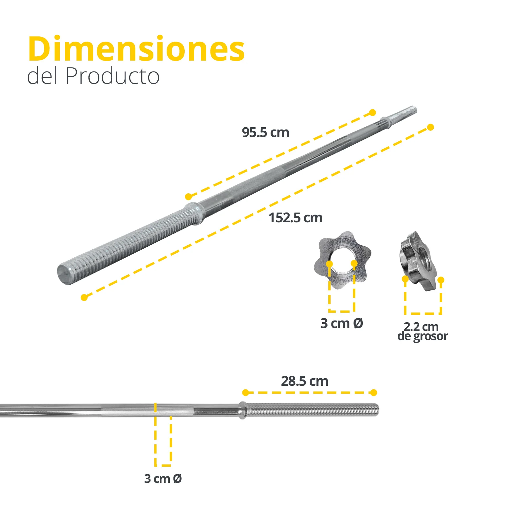 Sé el primero en valorar “BARRA RECTA 152.5 CM LARGO CON MANGO DE 30 MM Y COLLAR DE ESTRELLA”